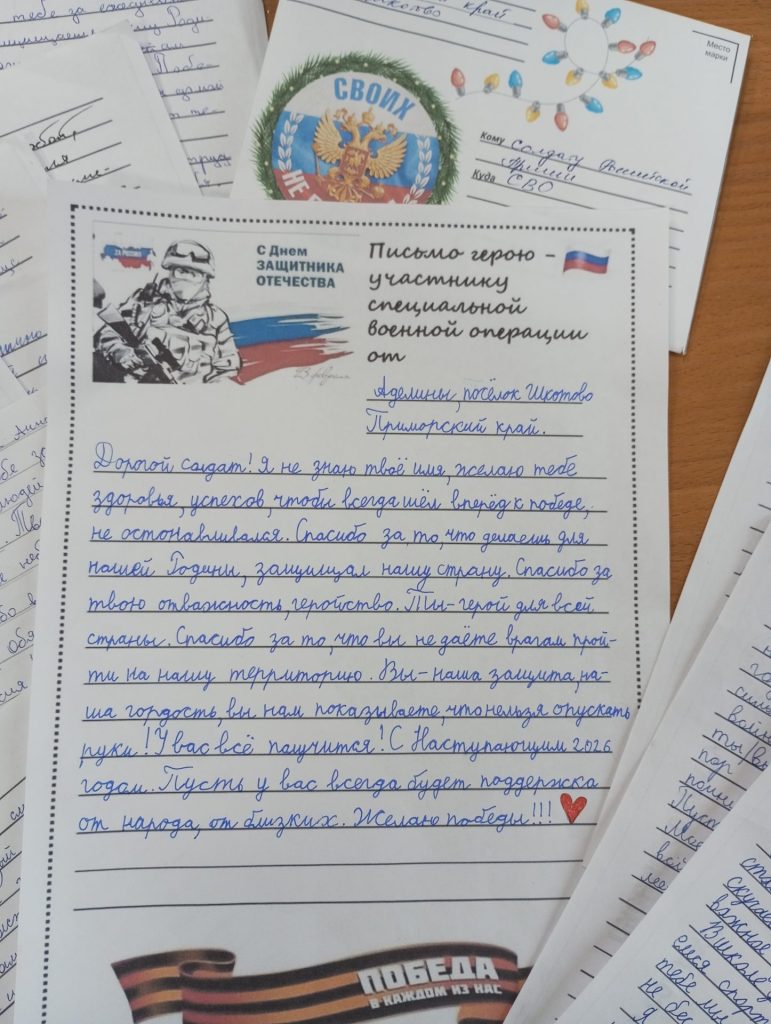 Центральная библиотека посёлка Шкотово приняла участие в трогательной патриотической акции «Письмо солдату», приуроченной ко Дню Героев Отечества. Школьники с особым чувством ответственности и внимания взялись за важное дело — написание новогодних писем для военнослужащих. В каждом послании они выразили слова искренней поддержки, тёплые пожелания и глубокую благодарность.