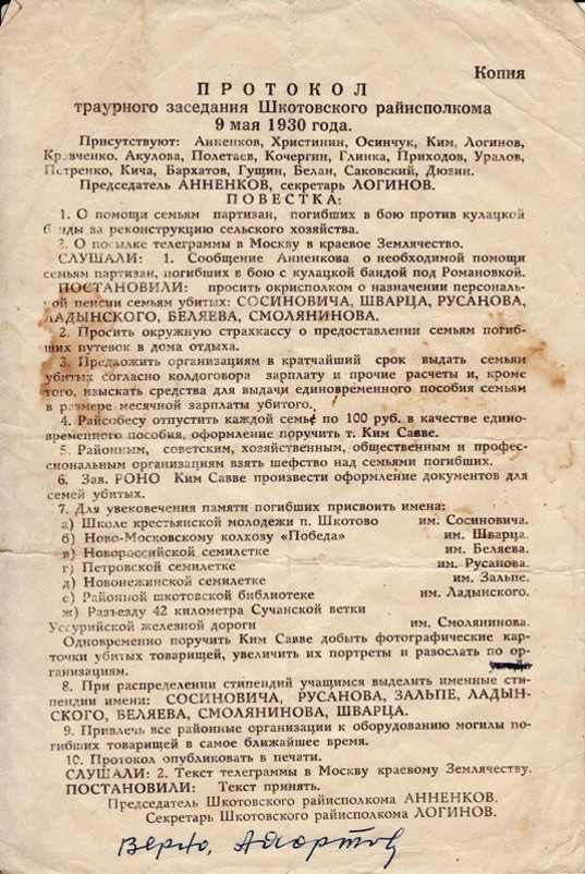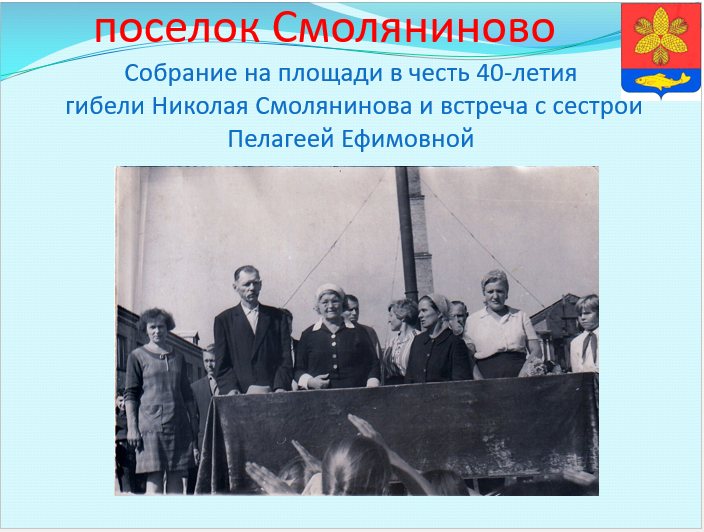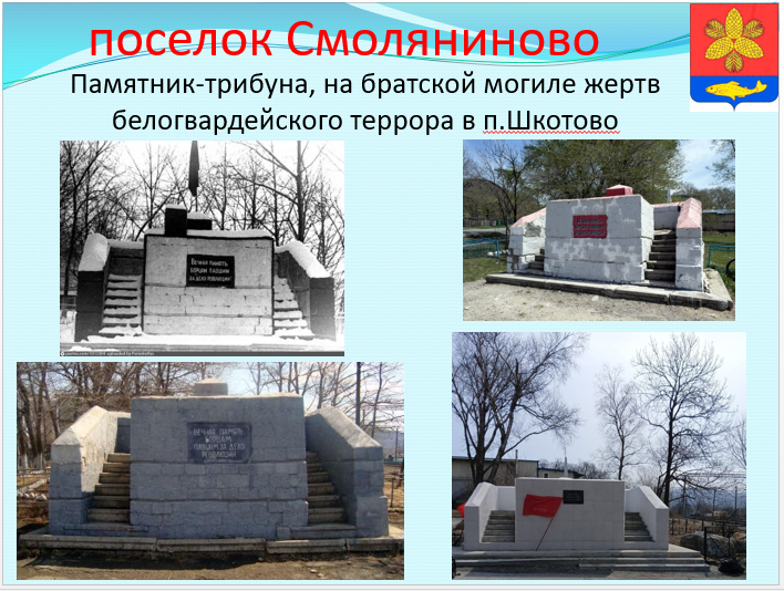 Николай Ефимович Смолянинов Родился в 1902 году в городе Никольск-Уссурийском в семье сапожника-кустаря. В 14 лет Николай остается за старшего. Много различных работ знали руки Коли: рассыльный, сапожник, работал и кочегаром, и поваром, и грузчиком в порту Владивостока. В 1920 году он вступает в народную охрану, становится комсомольцем. Упорная мысль — учиться, никогда не покидала его. В 1927 году заканчивает в г.Хабаровске техническую школу. В 1929 году был направлен в Шкотовский район на станцию Кангауз (ныне Анисимовка). Весной, в мае 1926 года был открыт разъезд «42 верста», а в январе 1930 года Николай назначен его начальником . В марте был направлен в села Цемухинской долины, в составе группы товарища Сосиновича. В апреле 1930 года ему был предоставлен отпуск, но учитывая сложную обстановку, он из района не выезжает. 29 апреля 1930 года после проведения собрания в селе Нововасильково, группа попала в засаду романовских кулаков. Куксенко и его сообщники открыли стрельбу и шесть коммунистов и комсомольцев погибли. Это были: Сосинович, Русаков, Шварц, Ладынский, Смолянинов и Белов. Николая и его товарищей похоронили в братской могиле в п. Шкотово. Исполком Шкотовского районного Совета своим постановлением от 9 мая 1930 года бывшему разьезду «42 км» присвоил имя Николая Ефимовича Смолянинова. С тех пор поселок с гордостью носит его имя.