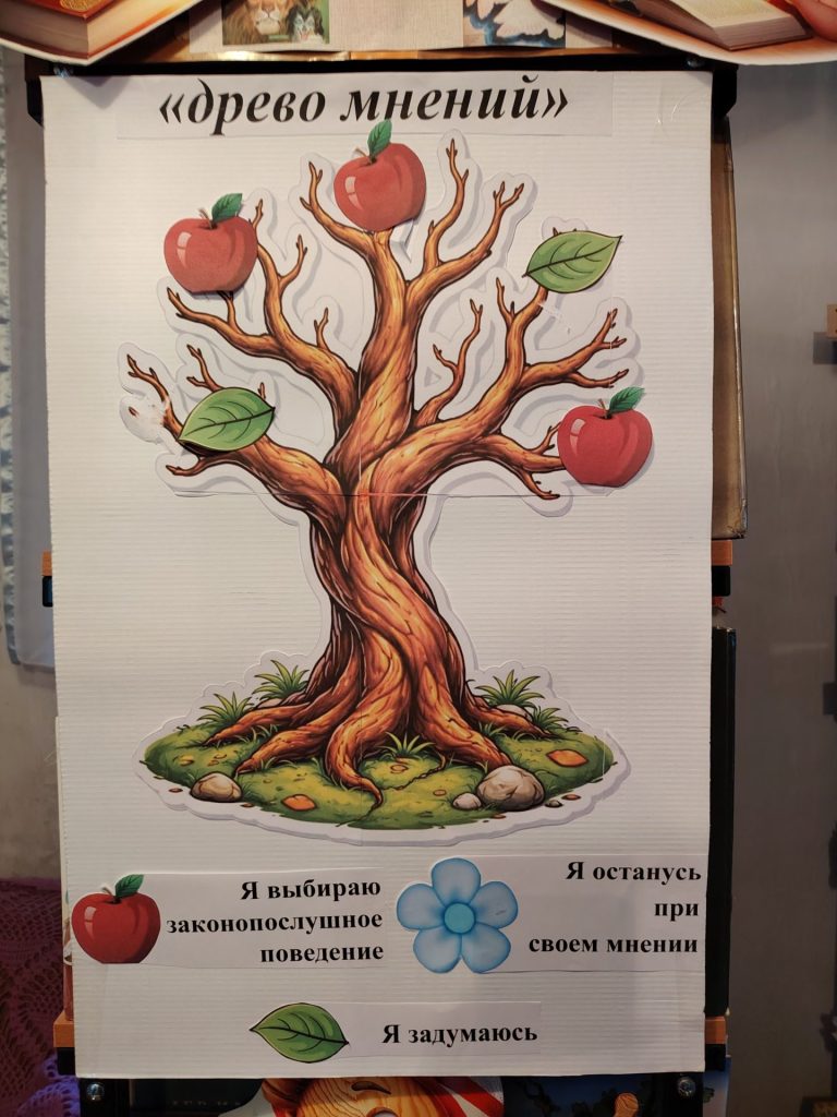 В завершении мероприятия оставили свое понимание от полученной информации на «древе мнений» в виде: «красное яблоко», что значит — я выбираю законопослушное поведение, «зеленый лист» — я задумаюсь, «голубой цветок» — я остаюсь при своем мнении.
