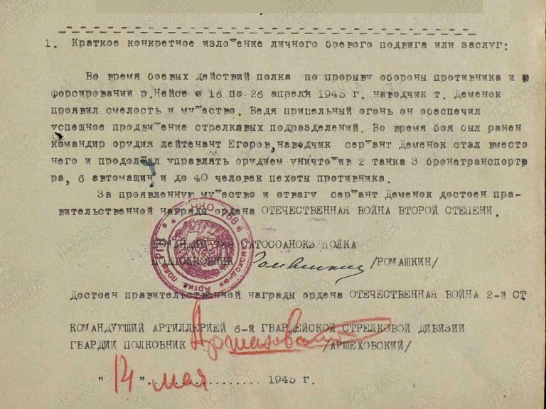 Его отец — Деменок Игнатий Михайлович, участник русско-японской войны 1905 г. Дедушка — Деменок Михаил Ефимович- георгиевский кавалер русско-турецкой войны 1877-1878 гг.