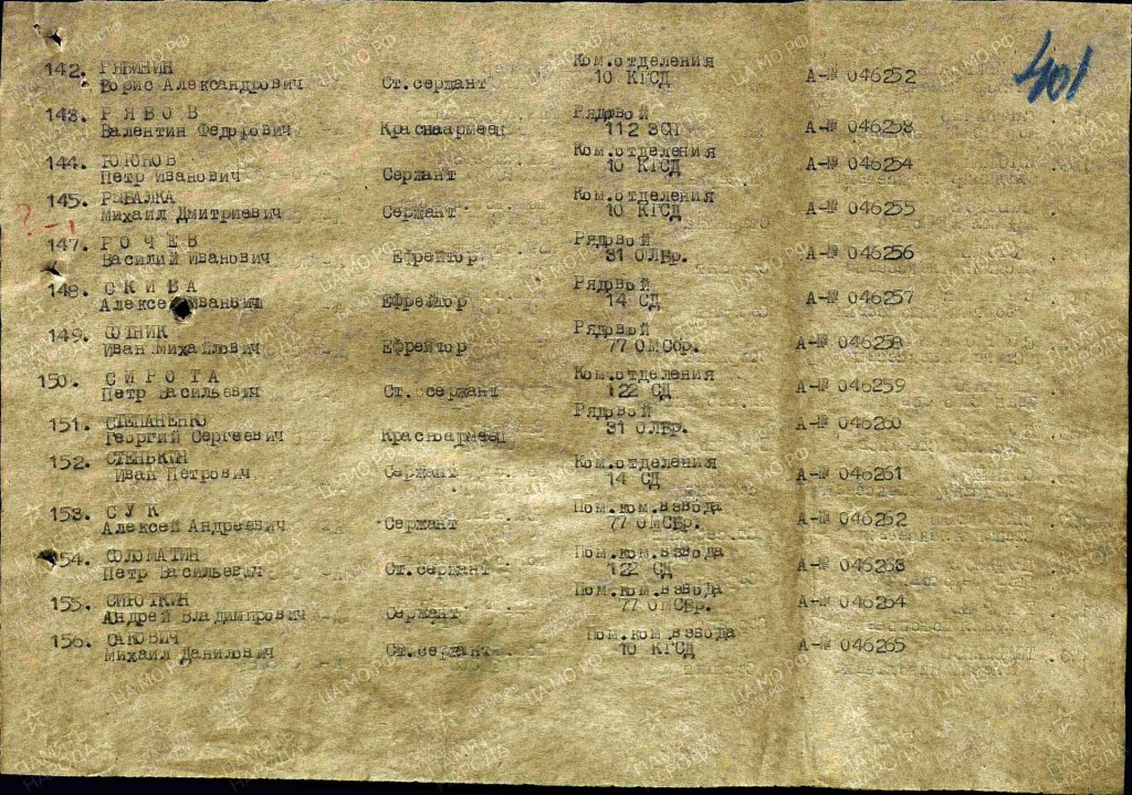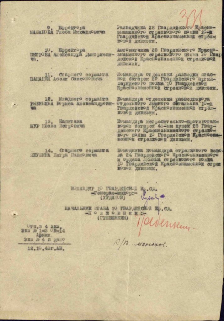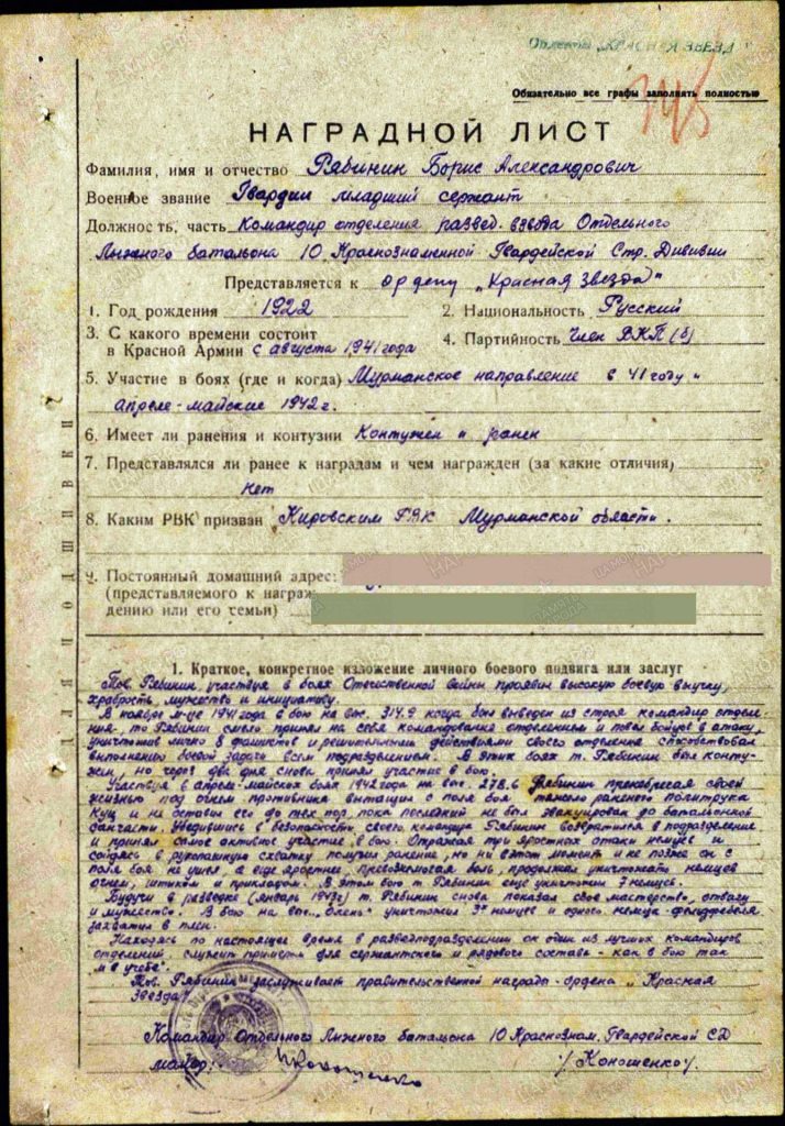 Будучи в разведке (январь 1943 года) снова показал свое мастерство, отвагу и мужество. В бою на высоте «олень» уничтожил трех немцев и одного немца-фельдфебеля захватил в плен». Младший сержант Рябинин Борис Александрович награжден Орденом «Красной Звезды» 25 сентября 1943 года.»